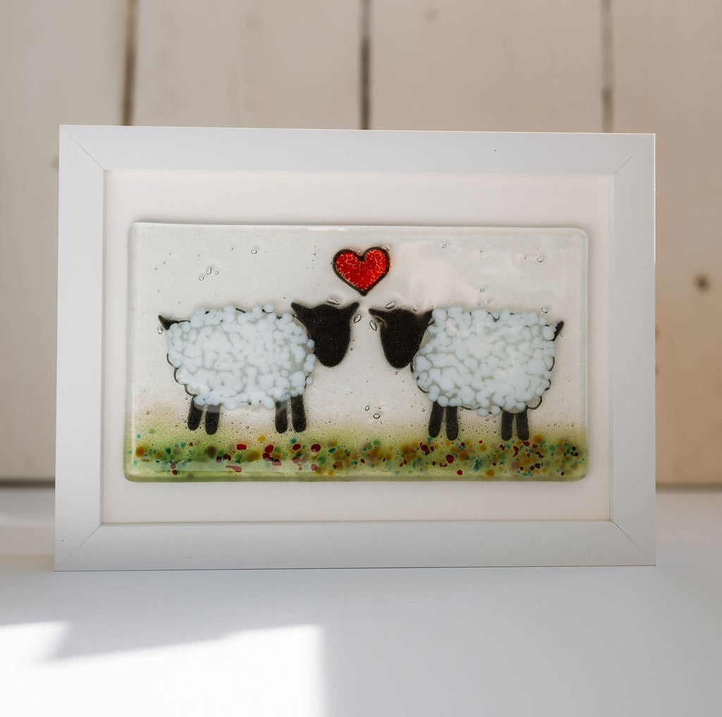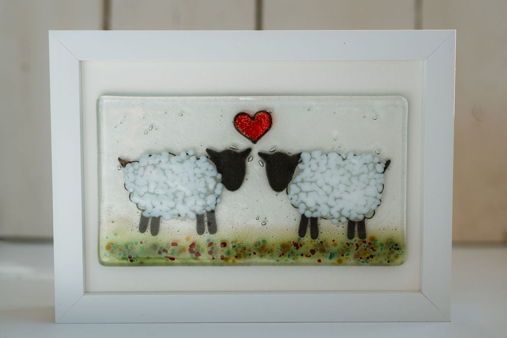 This fused glass Sheep small curve is inspired by the sheep grazing in the field at the back of the studio. It is made fusing two sheets of glass together using enamels, green and white frit to give the design. Hand made in our studio in Kirkwall Orkney.